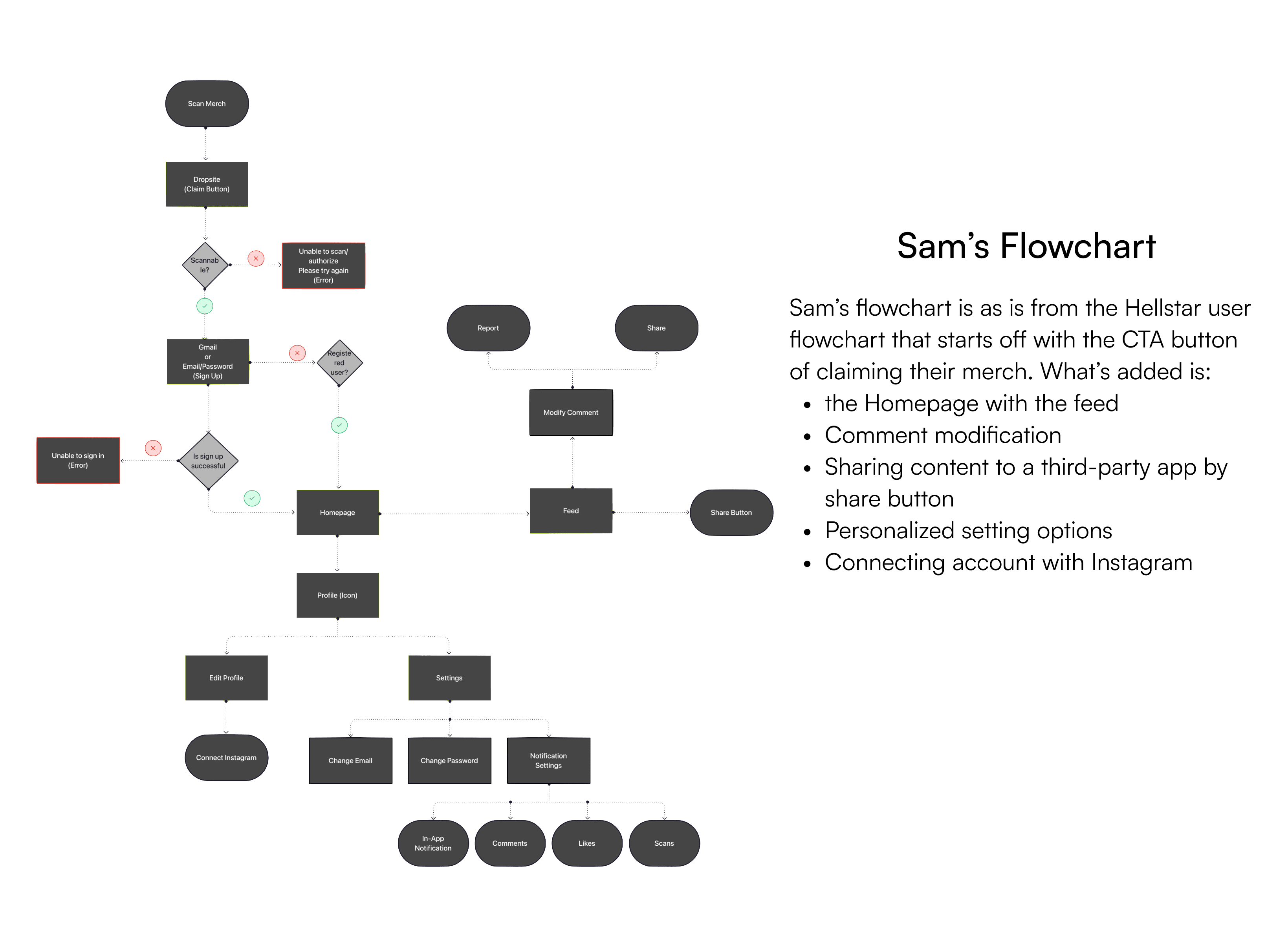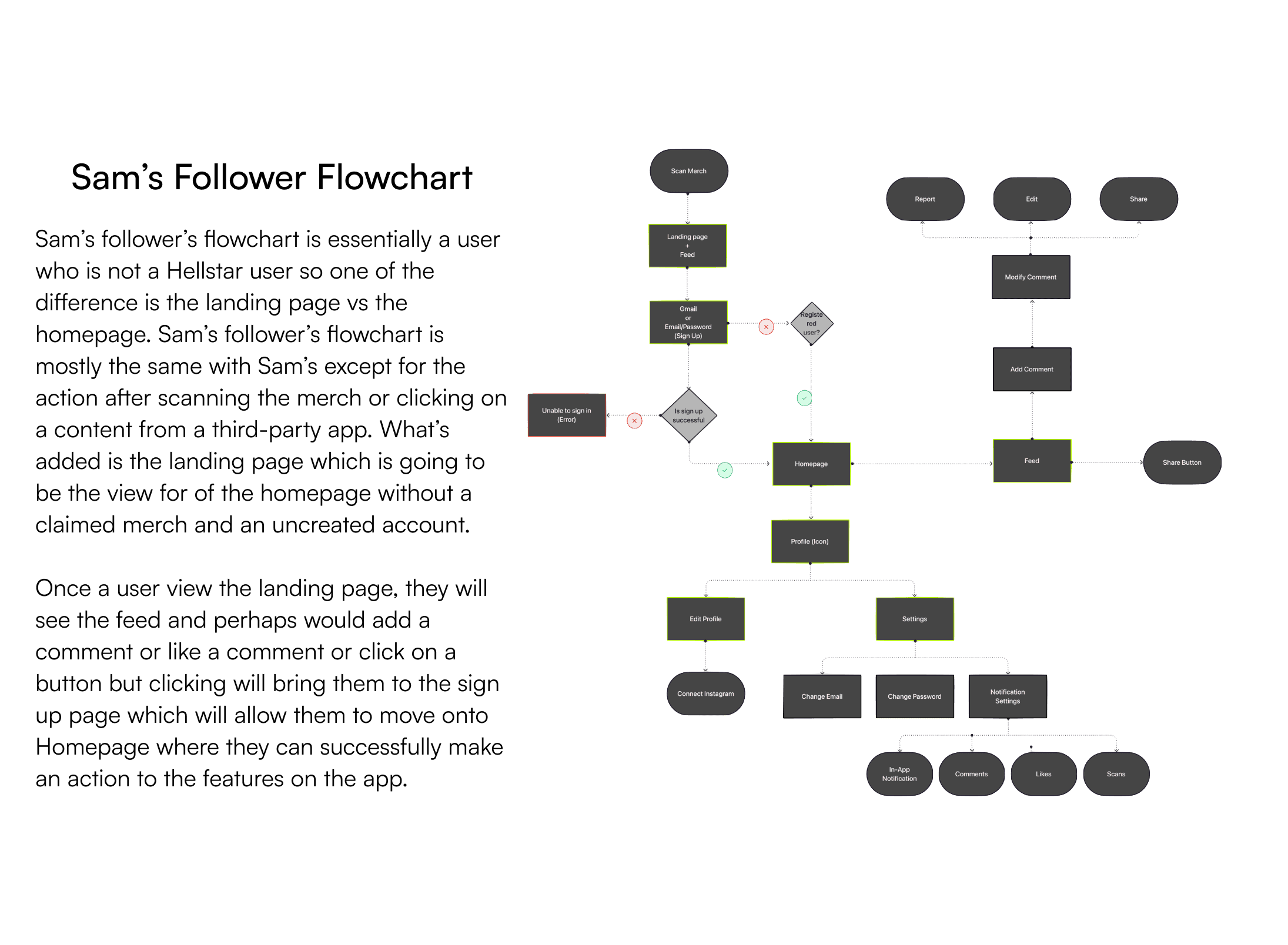 My first step was to create user flows between Sam’s (Hellstar user) and Sam’s followers (Hellstar viewer).