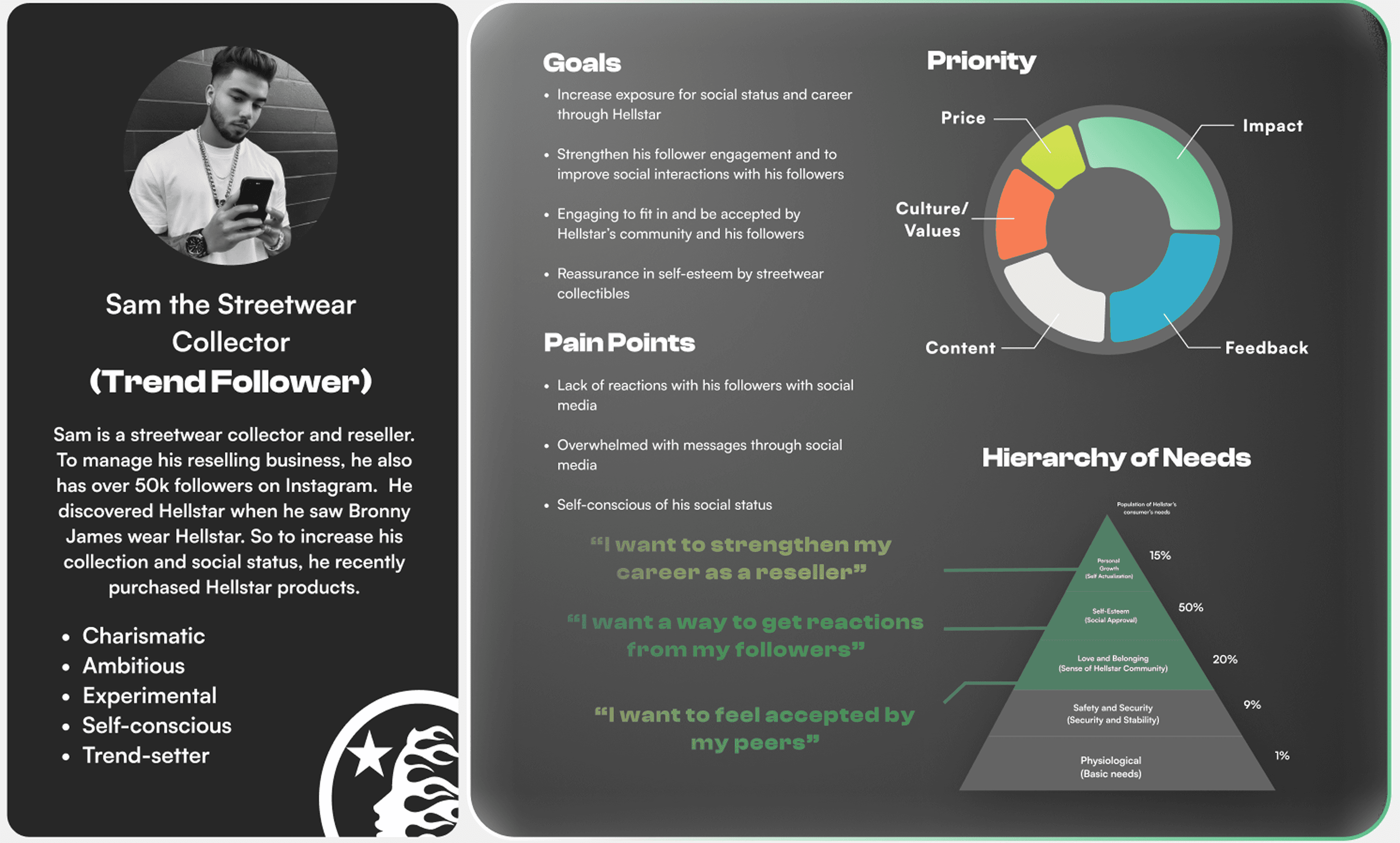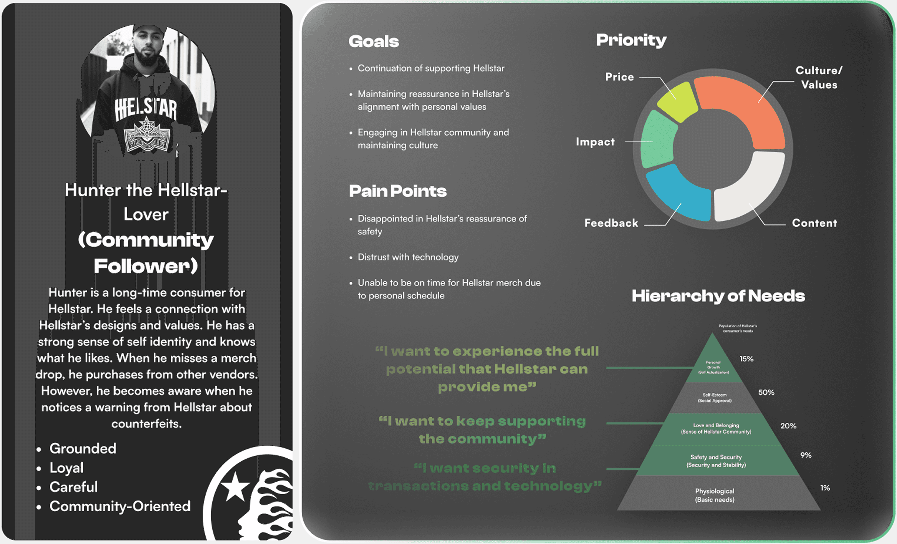 By inspecting Hellstar’s consumers and target market, the Hellstar authentication app should base on the two personas of Hellstar’s consumer; Trend Follower and Community Follower. Both persona’s values and Hellstar’s branding ultimately leads to “Streetwear Hype,” which is what Hellstar’s tight-knit community shares in value and what most Hellstar’s consumers want.