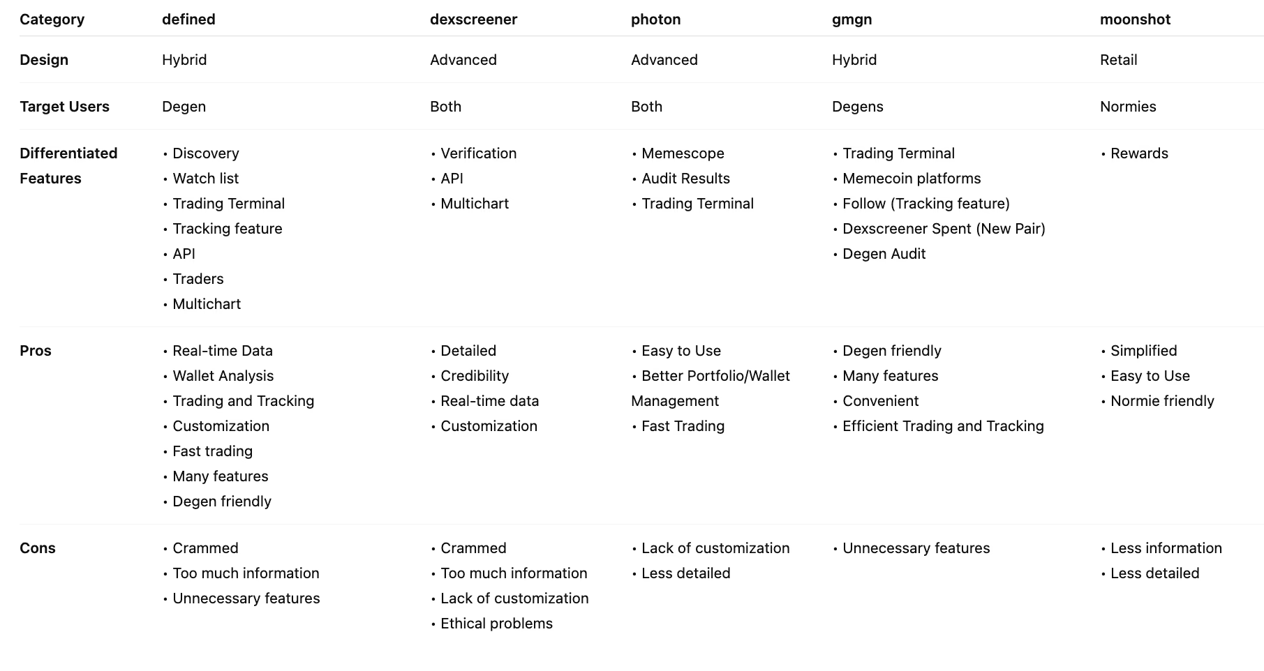 Find a middle-ground between Moonshot (retial) and Photon/BullX for degen which is a term for avid crytpo traders who are long in the space. Essentially, Defined is looking for a design for their product to have a mixed of Photon/BullX users who are skilled and more professional vs Moonshot users who aren't as concerned about details like MEV.