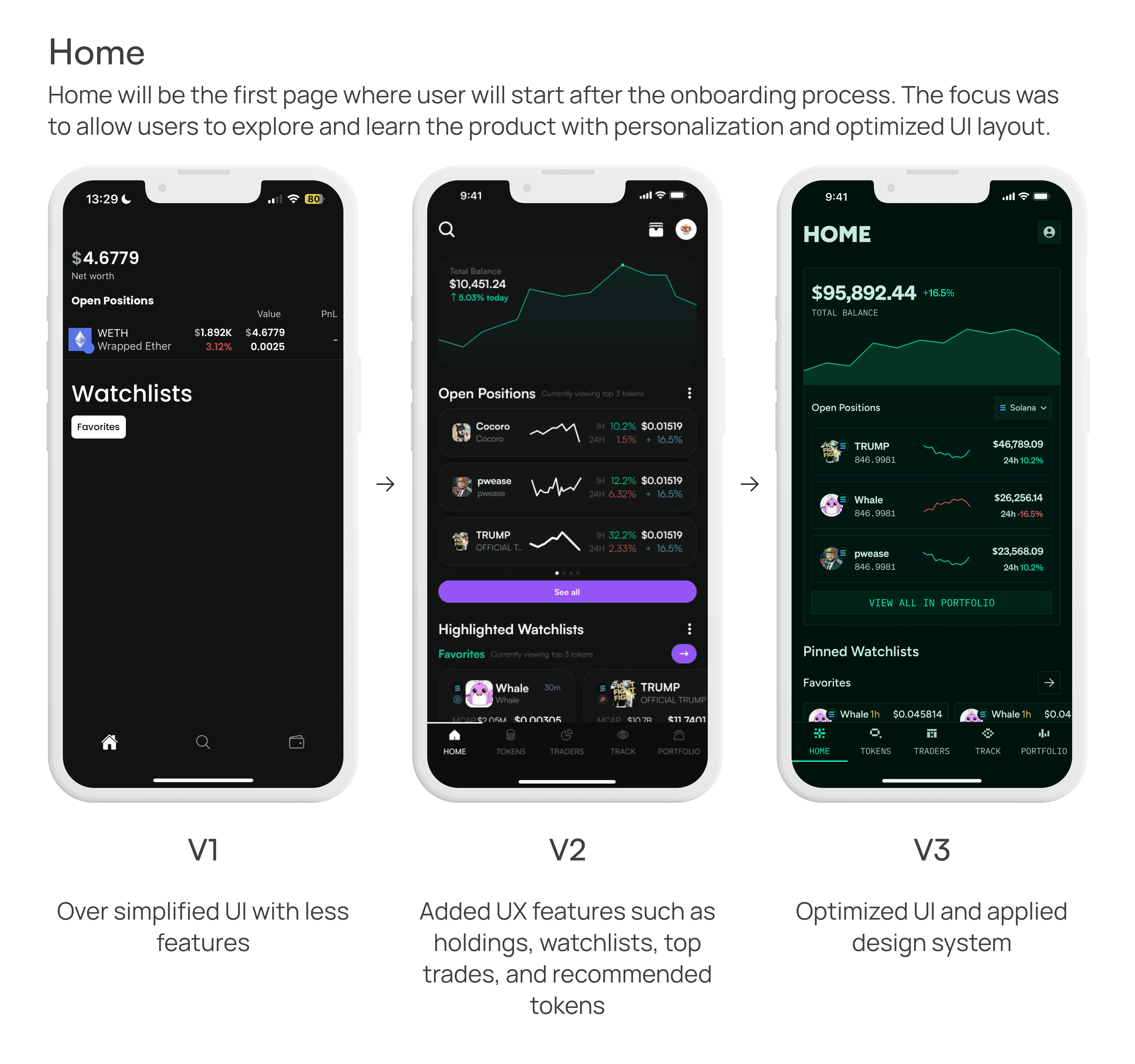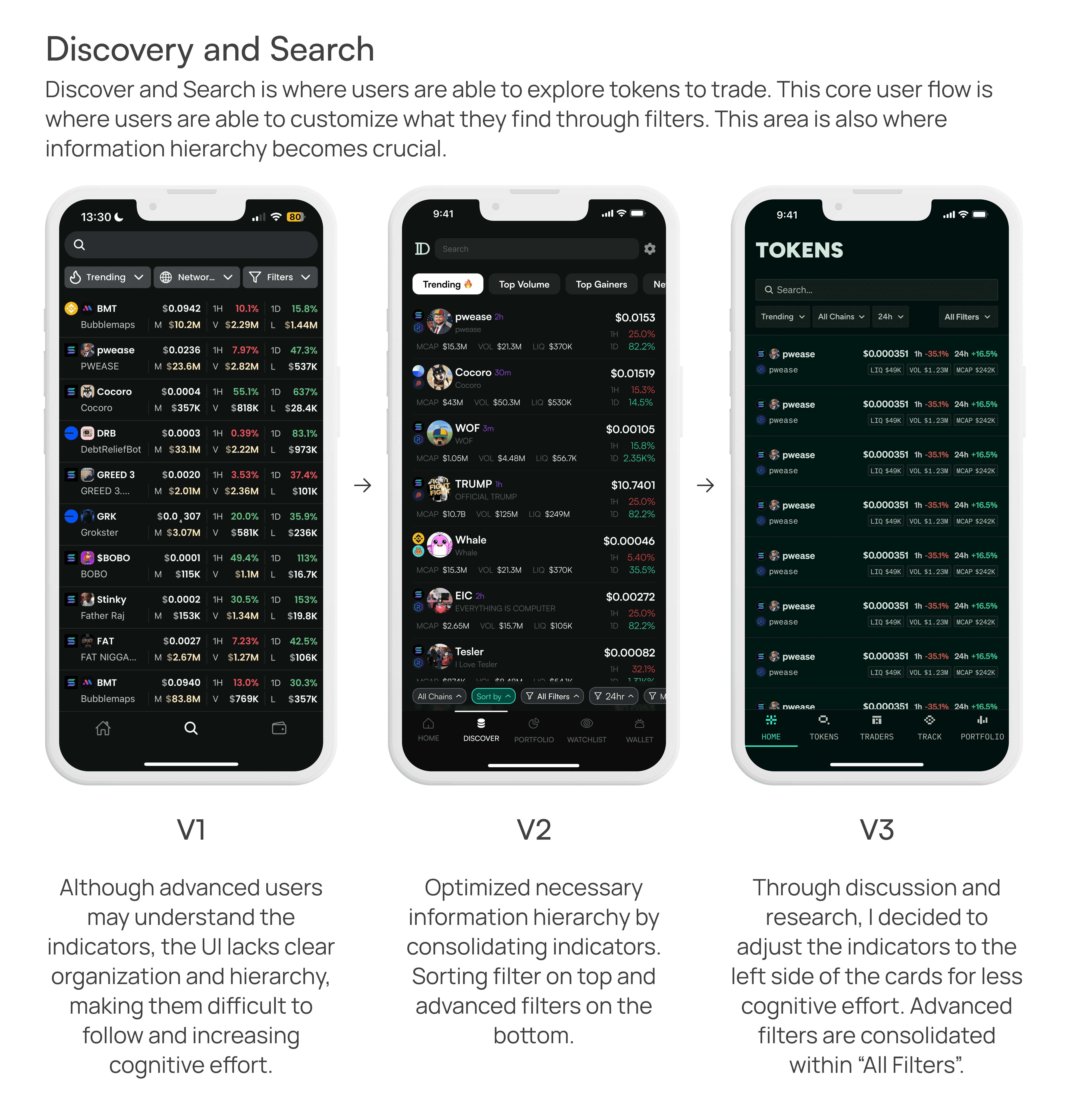 During my role as a product designer at Wonderstruck Studio, a Web3 design agency, I worked with a high-growth startup, who was in the process of rebranding and expanding its product offering. Originally launched as a TestFlight website, the company wanted to transform the platform into a fully developed iOS app and desktop application. The trading platform that sets itself apart by allowing users not only to browse and analyze tokens but also to trade directly within the platform—something most competitors don’t offer. Their mission is to create the fastest and most accurate token discovery, charting, and trading platform, empowering users with real-time insights and seamless execution across devices.